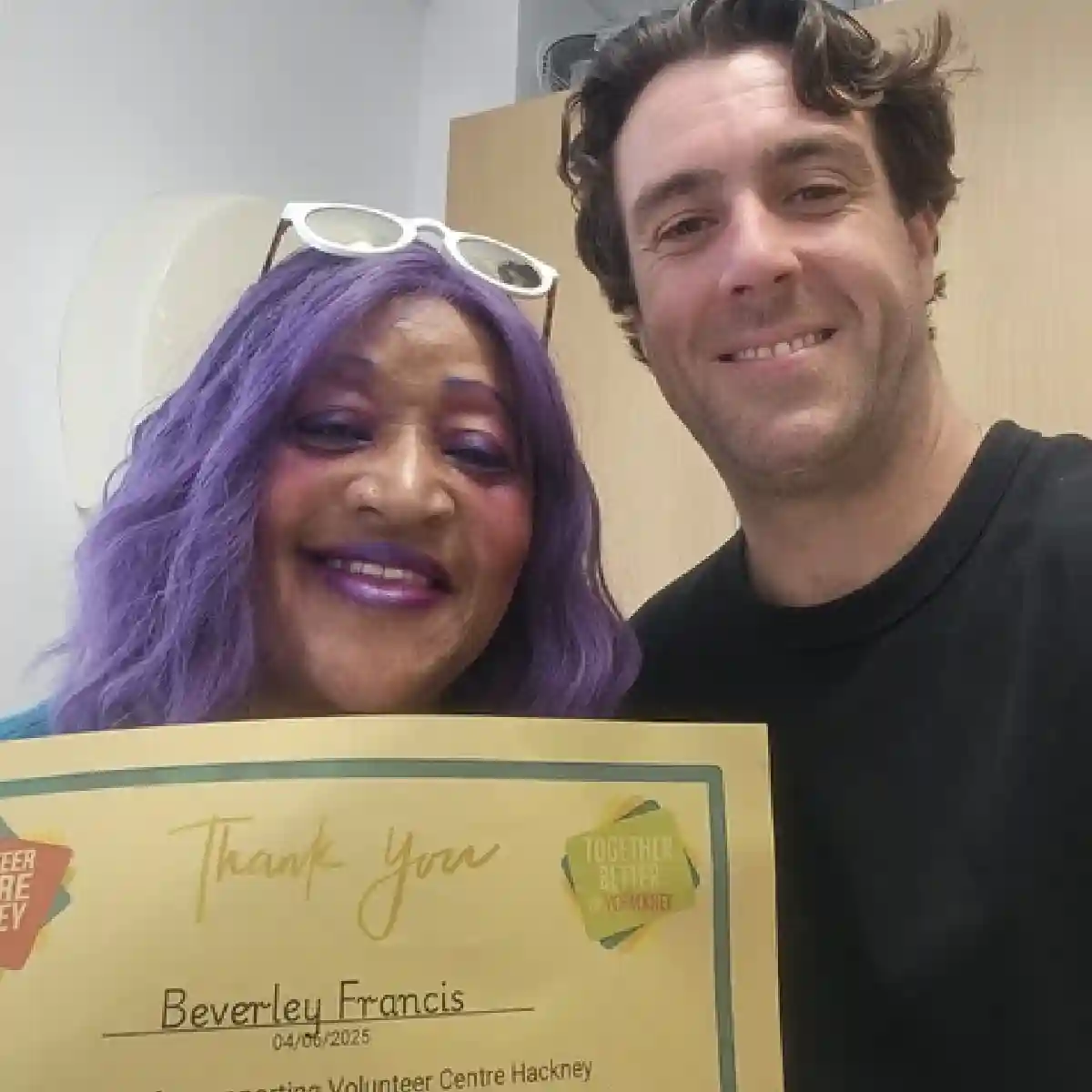 Our Together Better volunteers across Hackney are very much valued! This photo shows Nightingale Together Better Co-ordinator Tom Fearon presenting volunteer Beverly Francis with another Volunteer Centre Hackney (VCH) certificate to add to her growing collection! Beverly has been making teas and coffees for the Nightingale Together Better group since it began meeting at the surgery, way back in March 2022.